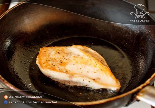 - Հավի կրծքամիսը համեմում ենք աղ և պղպեղով, ապա տապակում բուսայուղով պատված թավայի մեջ: