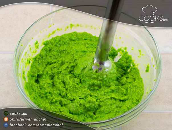 - Կանաչ ոլոռին ավելացնում ենք ձուն ու թթվասերը և բլենդերով հարում ենք, որպեսզի ստանանք հարթ զանգված։