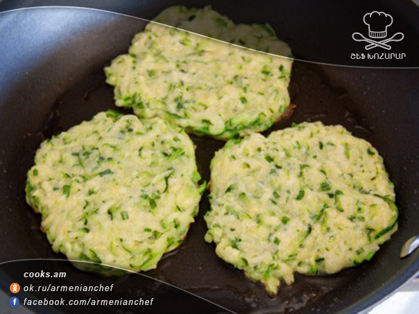 - Դդմիկները լվանում ենք, պոչի հատվածը կտրում: Խոշոր քերիչով քերում ենք, լցնում մեծ կաթսայի մեջ, ավելացնում 1 թ/գդ աղ ու խառնում: 10 րոպեով դնում ենք մի կողմ: 10 րոպե անց ձեռքով քամում ենք, որպեսզի ավելորդ հեղուկը դուրս գա: Հետո ավելացնում ենք կտրատած կանաչ սոխը, ձուն, սև պղպեղն ու լավ խառնում ենք:
