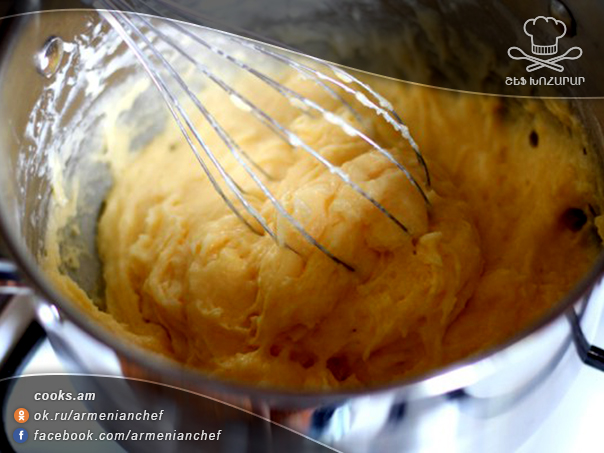 - Պատրաստում ենք կրեմը: Դեղնուցները խառնում ենք 80 գր շաքարավազի ու վանիլինի հետ, ավելացնում օսլան ու հարում այնքան, մինչև խառնուրդը սպիտակի ու ծավալով մեծանա: Կաթը հասցնում ենք եռման ու անընդհատ հարելով բարակ շիթով լցնում խառնուրդի մեջ: